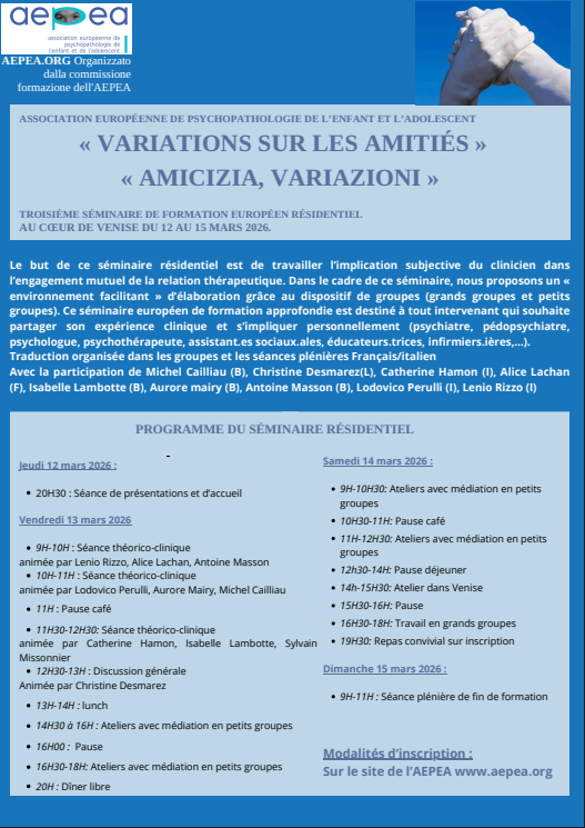 “Variations sur les amitiés” Du 12 au 15 Mars 2026 Infos & Inscription (PDF) GROUPE D’ÉTUDE ET DE RECHERCHE CLINIQUE EN PSYCHANALYSEDE L’ENFANT ET DE L’ADULTE. “Le psychodrame psychanalytique : un dispositif thérapeutique au coeur de l’inconsient “ Vendredi 20 Mars 2026 Infos & inscription (PDF)